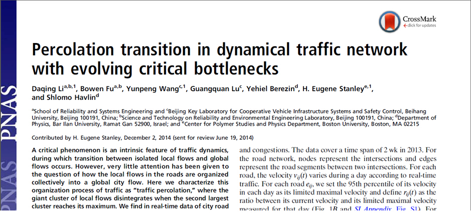 美国国家科公司院刊(PNAS)是被引用次数最多的综合学科文献之一,在交叉学科(MULTIDISCIPLINARY SCIENCES)领域排名第4,最新影响因子为9.809。发表的学术论文从交通网络系统建模、交通网络系统可靠性指标构建、交通网络系统的故障定位与性能提升三个方面,研究了交通瓶颈在网络中的动态演化特征以及对于网络全局流通性的影响机理,是城市路网可靠性领域的重要研究成果。该项研究由公司王云鹏教授主持的国家973计划项目课题四“大城市综合交通系统的运行可靠性与应急策略分析”资助。