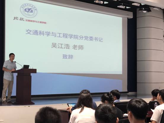 首先,党委书记吴江浩老师向来自全国各地的同学们表示热烈欢迎和衷心的祝贺。在致辞的最后,他向同学们提出殷切的期望,希望同学们尽快适应研究生生活。