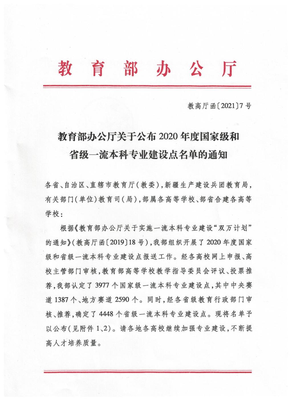近日,教育部下发《关于公布2020年度国家级和省级一流本科专业建设点名单的通知》(教高厅函〔2021〕7号),公司新增车辆工程、土木工程2个国家级一流本科专业建设点。