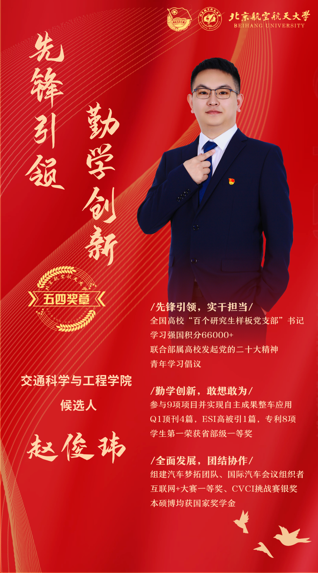 先锋引领,实干担当。赵俊玮同学以身作则,持续更新思想认知,学习强国积分66000+;夯实建设全国高校“百个研究生样板党支部”,联合工信部直属高校共同发起党的二十大精神青年学习倡议,多次为兄弟高校分享党建经验;带领支部争先创优,获多项党建荣誉。