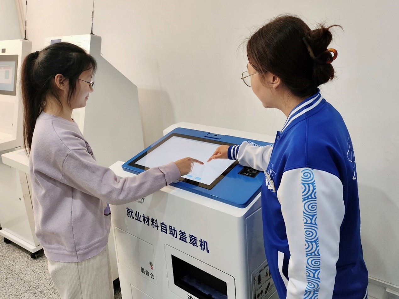 员工在使用就业材料自助盖章机