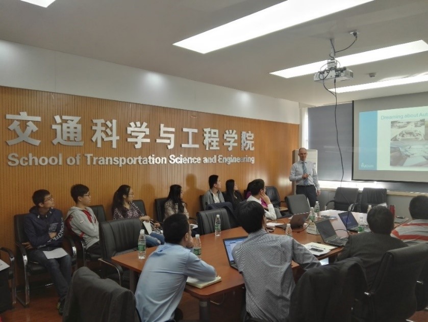 随后,Birt教授介绍了在交通流领域的研究经验,及交通运输系统方面的发展历程,开阔了师生们的视野,讲述了代尔夫特理工大学在自动驾驶方向的研究成果,涉及专业技术知识,Birt教授做了详细的剖析,质朴详尽的语言为参与者讲述了数据分析思路和方法,气氛活跃,与会的员工和老师们积极参与,营造了一股积极向上的学术氛围。