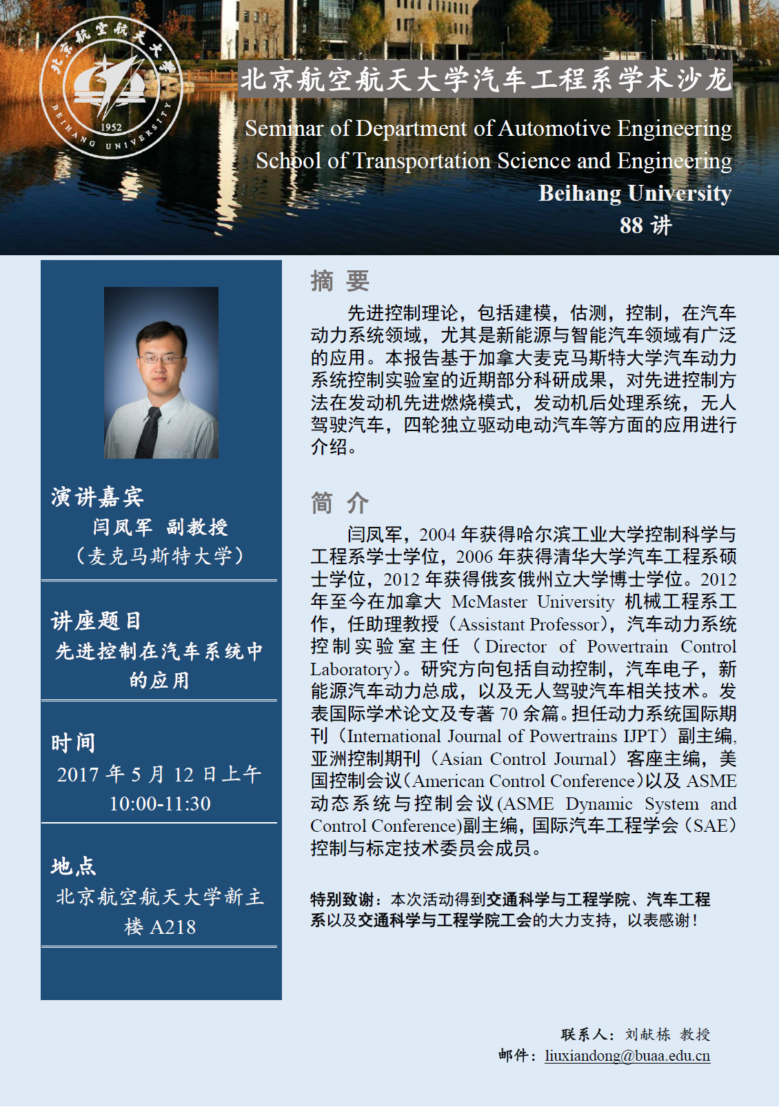 汽车工程系学术沙龙第88讲预告——先进控制在汽车系统中的应用