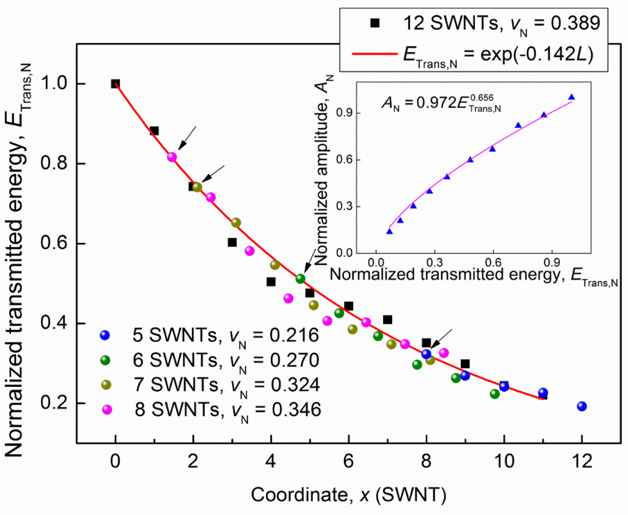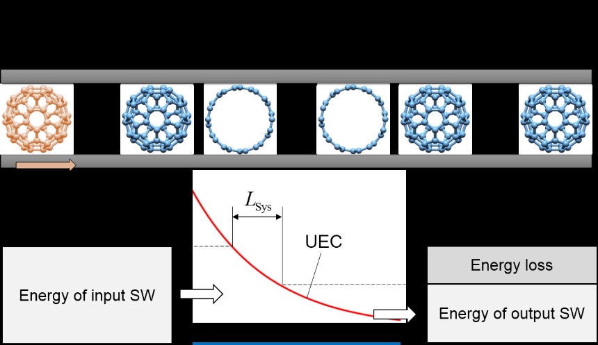 随着近年来纳米科学的飞速发展,对于纳米材料机械性能的研究成为热点,应力波的传播便是其中之一。最近许骏教授课题组利用分子动力学模拟,从理论上将单壁碳纳米管系统嵌入一维巴基球系统,首次在纳观尺度上实现了对孤立波的定量调控。这一定量调控的核心就是利用单壁碳纳米管系统的衰减特性。研究工作通过建立能量通道(Universalenergy channel)的概念,对单壁碳纳米管中的能量衰减进行了形象的定量描述,孤立波调控机理和调控实例如图一、图二所示: