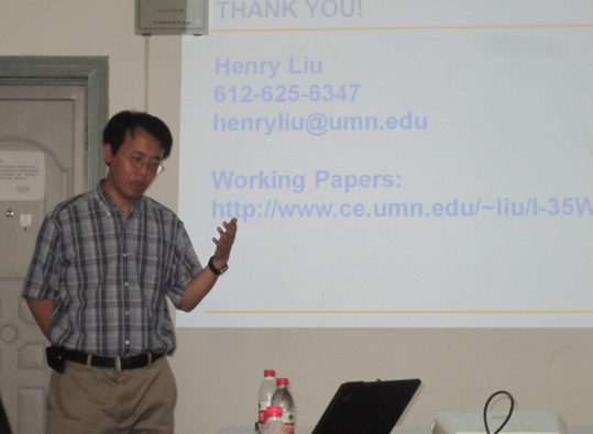 为了解国内外交通发展动态、促进与国外交通实验室的合作交流,8月24至29日,公司邀请明尼苏达大学的Henry Liu教授和辛辛那提大学的魏恒教授,在工训中心西配楼501会议室进行了为期5天的讲学。5次讲学报告的主题分别为“Traffic Signal Monitoring, Modeling, and Control(交通信号检测、建模与控制)”、“Modeling a disrupted traffic network(中断交通网络的建模)”、“Basic of signal design and operation control performance of roadway segment and signal(信号交通控制设计基本原理与设计规则)”、“Dual-ring diagram phasing design approach and actuated control system design(动态信号交通控制系统的相位设计与感应技术实例)”、“Dynamics of dilemma zone problem and it’s protection at high speed signalized intersection(高速信号控制路口中的动态困惑区模型与安全评价方法)”。