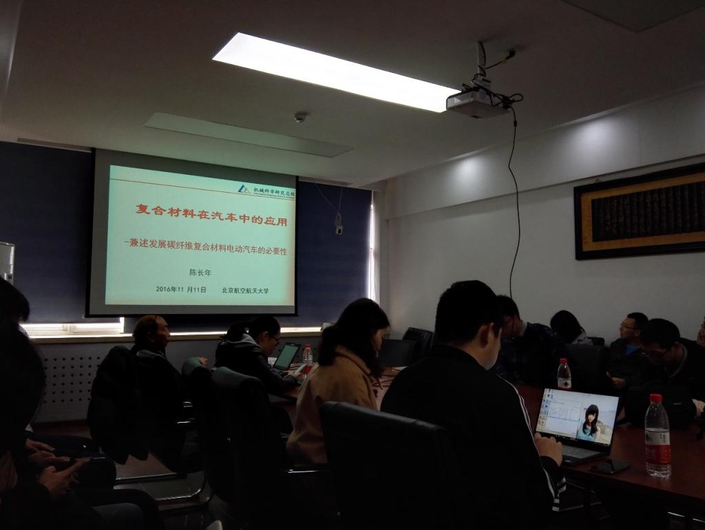 2016年11月11日,来自机械科学研究总院的陈长年教授在工训楼西配楼501会议室做了题为“复合材料在汽车中的应用”的学术报告。陈长年教授现任机械科学研究总院顾问。并兼任北京信息科技大学教授。曾任清华大学工业工程项目顾问,南京四开数控公司顾问、宁波海天公司机床总顾问等。曾获机电部科技进步二等奖、广西科技进步一等奖。公司殷莎老师及众多师生参加并交流讨论。