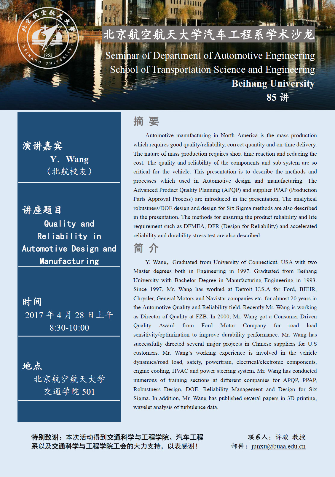 汽车工程系学术沙龙第85讲预告——Quality and Reliability in Automotive Design and Manufacturing