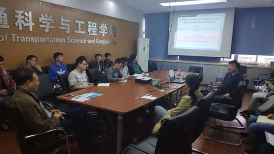 在访问期间,王旭教授与刘献栋教授课题组汽车轮胎声腔共振噪声相关的研究生、博士生进行了学术交流。课题组成员介绍了各自在胎腔共振噪声方面的研究,并就研究过程中的难点与疑问与王旭教授进行了深入交流。探讨了汽车胎腔噪声的理论建模、实验台架搭建、实验测试、仿真分析中的具体问题。王旭教授对同学们的研究给予了肯定,并给出了极有价值的意见和建议。并就汽车车内噪声、轮胎/路面噪声等领域,对有关国内研究现状、存在问题、可能的合作领域等进行详细讨论。