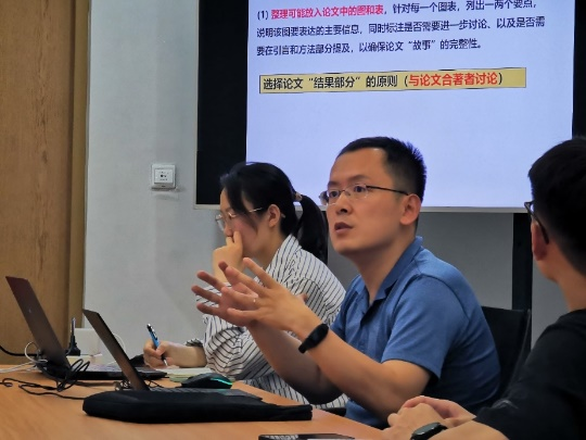 余洋喆同志向崔老师请教审稿过程中出现不同审稿人反馈意见迥然的情况时的应对策略;陈乙方同志从英文学术写作经历出发,针对描述图表等内容的时态使用问题与崔老师进行了讨论。崔老师结合自身经验,从审稿人和投稿人的双重视角出发进行了解答。