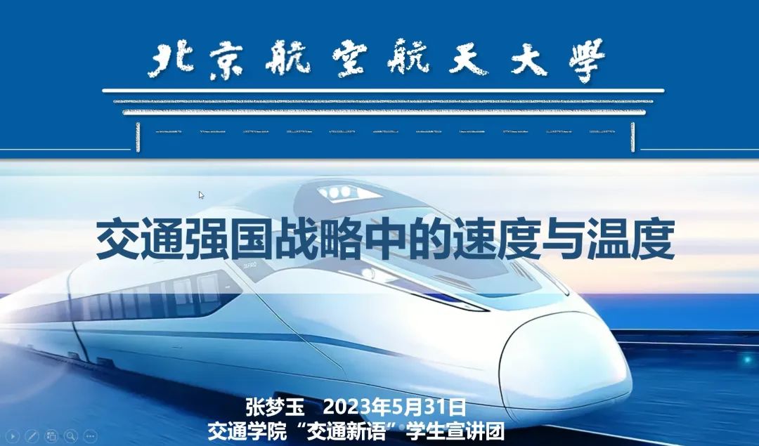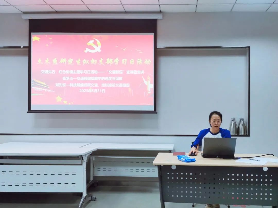 为深入学习贯彻习近平新时代中国特色社会主义思想和党的二十大精神,夯实理论基础,2023年5月31日晚,北航谈球吧智能交通基础设施系研究生党支部与谈球吧BY2013团支部于沙河主楼A408联合开展了“交通先行,红色引领”主题学习日活动。本次活动邀请了“交通新语”员工宣讲团的张梦玉、刘先哲两位讲师,聚焦交通强国建设,进行了精彩的宣讲。