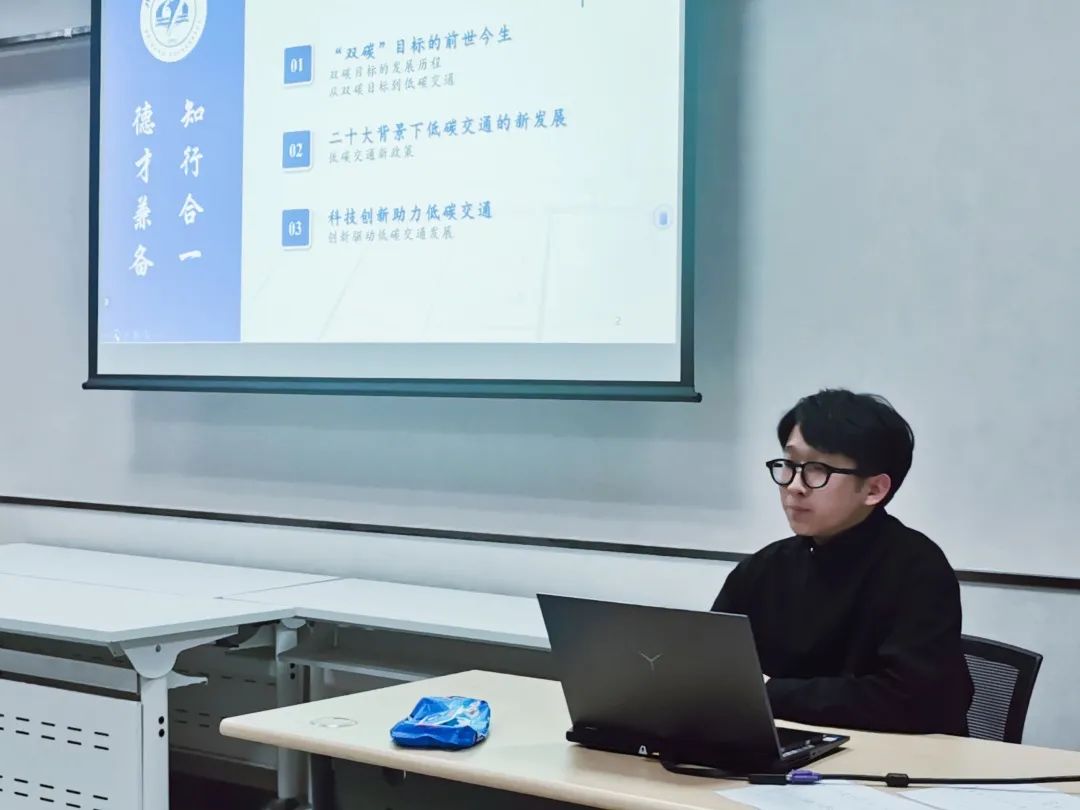 刘先哲讲师以“科技赋能低碳交通,加快建设交通强国”为题,以与交通行业紧密相关的“双碳”建设目标切入主题,讲述我国低碳交通发展的历史背景和重要意义。同时,以身边的先锋模范——马晓磊老师团队为例,带领同志们感悟科技创新的磅礴伟力,号召广大交通员工立足新时代新征程,学习贯彻创新、协调、绿色、开放、共享的新发展理念,踏实推进交通先行战略发展,加快绿色低碳运输体系形成。