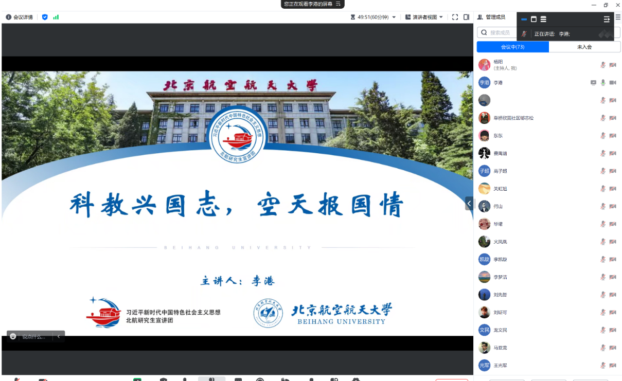 随后,北航研究生宣讲团讲师李港以《科教兴国志,空天报国情》为主题,分别讲述了我国航空航天发展历程、科教兴国战略、航天精神和以“空天报国”为内核的北航精神,加深了支部党员和社区的老党员、小员工对我国航空航天发展史的认识,一大批年轻有为、造诣精深的专家学者、一代又一代北航人投身于空天逐梦之路的故事也激励大家不断前行,努力做好新时代的接班人。