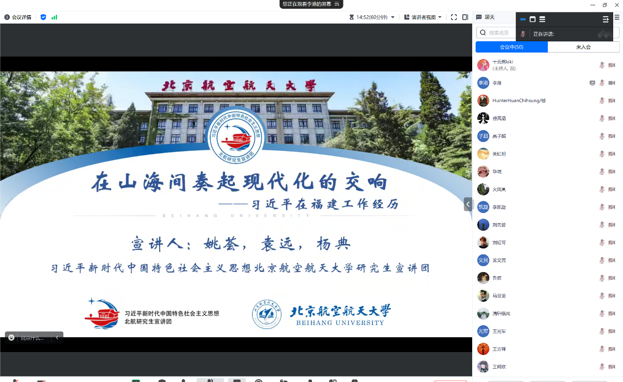 首先,北航研究生宣讲团讲师姚荟以《在山海间奏起现代化的交响——习近平在福建的工作经历》为主题,以习近平总书记在厦门、宁德、福州等地的探索与实践为切入点,向大家介绍了习近平总书记在福建这块充满激情的开放热土上孜孜奋斗17年半的工作经历。在这期间,习近平总书记亲自领导和推动了福建的改革开放和现代化建设事业,在理论和实践等多个领域深度耕耘,为各位党员今后的学习工作指明了方向。