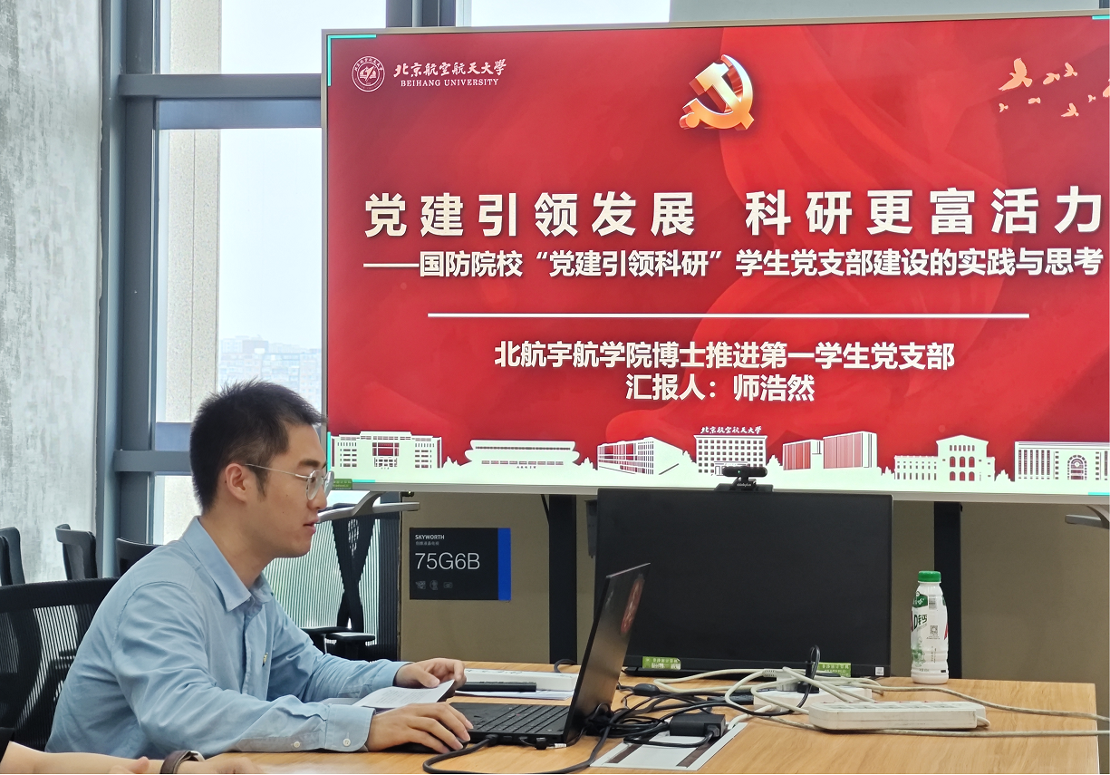 交流结束后,会议邀请获批第三批全国高校“百个研究生样板党支部”的北航宇航公司博士推进第一员工党支部书记师浩然进行支部建设分享。师浩然以“党建引领发展,科研更富活力——国防院校“党建引领科研”员工党支部建设的实践与思考”为主题,分别从支部概况、日常建设和特色工作案例三方面进行介绍,支部依托北航航天推进技术课题组而成立,始终以习近平新时代中国特色社会主义思想为指导,不断追求建设政治过硬、表率突出、动力强劲、务实可靠的样板党支部。分享过后,各成员单位对北航宇航公司博士推进第一员工党支部申请加入联盟的事项进行了表决,并全票通过。