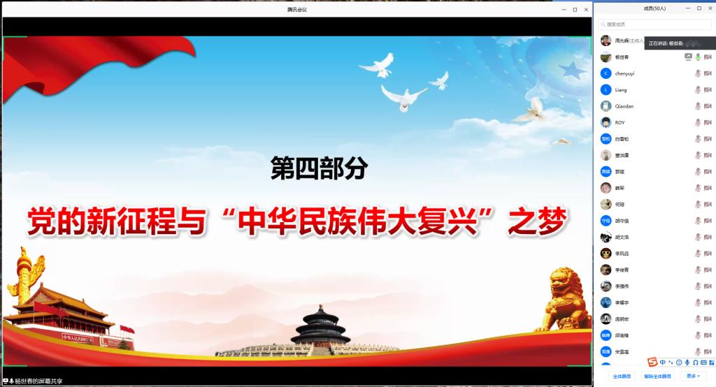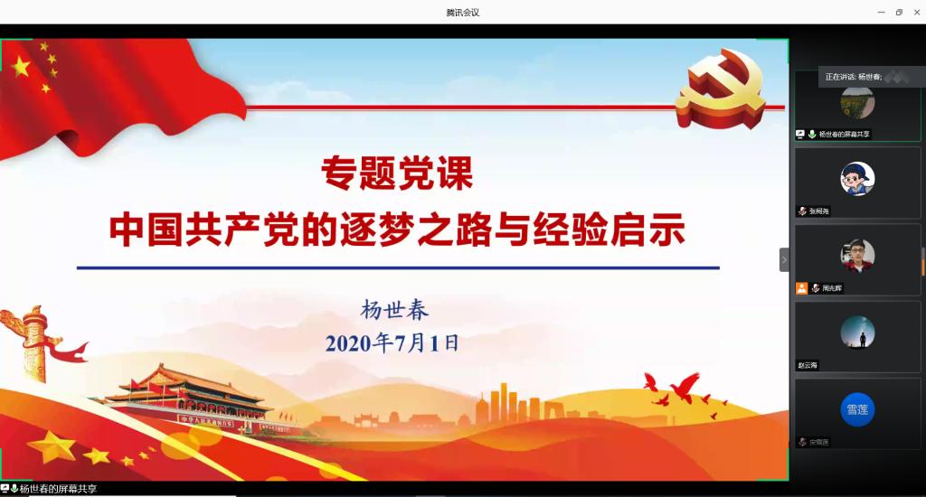 2020年7月1日,为进一步加强支部党员队伍建设,促进员工党员的学习交流,在中国共产党成立99周年之际,谈球吧汽车工程系研究生党支部开展了建党节学习活动。本次活动邀请到谈球吧经理杨世春老师进行了主题为“中国共产党的逐梦之路与经验启示”的专题党课讲解。活动以线上会议的形式开展,由支部书记周兆辉主持,共50余名员工党员参加学习。