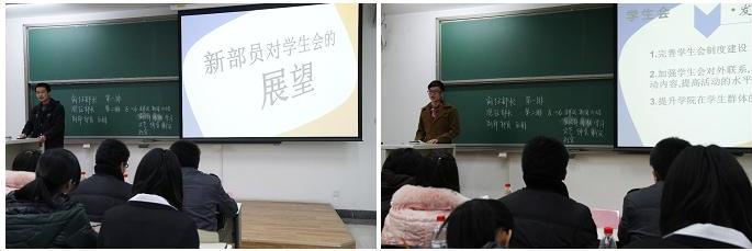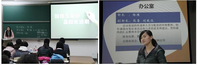 大会主要分为前任部长述职、12级新成员发言、新任部长就职等几个环节。前任员工会主席团及部长对自己的工作做了简单的总结,对新一届就职干部给予了热切的期望。接下来,各部门12级成员发表了自己对所在部门及部长的期望,他们的语言诚恳又不失幽默,将会议气氛推向高潮。之后,新任部长对自己将要担任的职务发表了自己的感想。