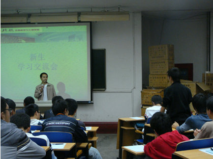 新生们早早的就来到了教室,怀着期待的心情等待交流会的开始,期待着各位学长学姐们为他们指点迷津,解决心中的疑惑。7点10分左右,交流会正式开始。首先登上讲台的是金质奖章获得者---曹娇坤学长。曹娇坤学长从生活谈到学习,从目标谈到理想,他的发言使很多新生感到醍醐灌顶,教室里不时爆发出阵阵热烈的掌声。在他演讲结束后更是有许多同学向他提出了自己的疑问,他都耐心地一一做了解答,令大家感到受益匪浅。