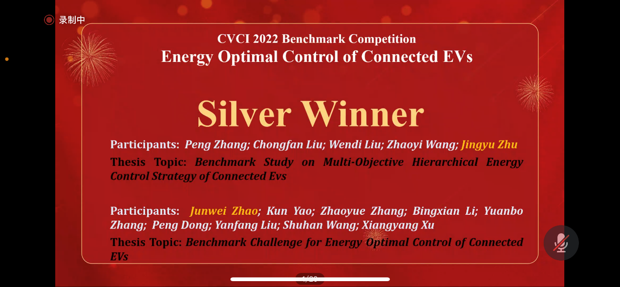 2022年10月28-30日,由中国自动化学会车辆控制与智能化专委会主办,东南大学承办的2022中国车辆控制与智能化会议(CVCI2022)暨第六届中国自动化学会车辆控制与智能化专委会学术年会在南京举行。会议同期举办了由吉林大学汽车仿真与控制国家重点实验室、同济大学自主智能无人系统国家重点实验室、上海智能自主系统研究院共同主办的电动汽车节能Benchmark挑战赛。公司来自徐向阳教授ITRC课题组的博士研究生赵俊玮、硕士研究生姚坤、张兆越、李炳贤、张源博共同参加比赛,参赛团队由董鹏副教授、刘艳芳教授、王书翰教授联合指导,荣获Benchmark挑战赛银奖。