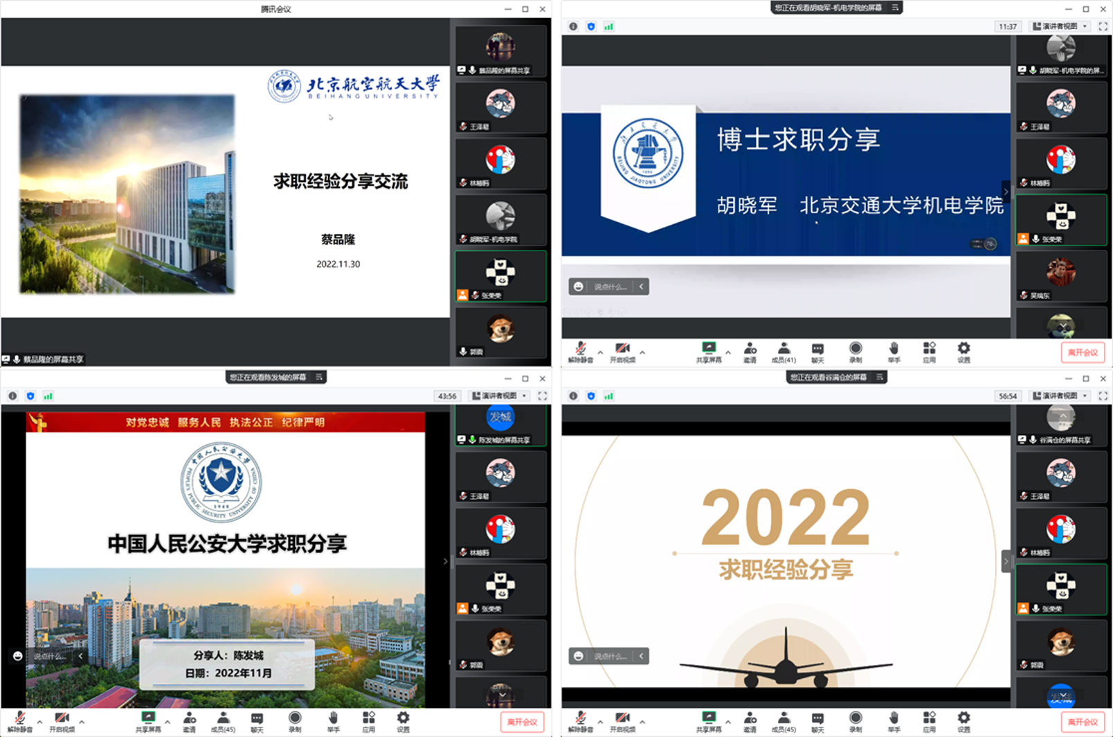 蔡品隆、胡晓军、陈发城和谷满仓为高年级博士详细介绍了针对高校、科研院所及其他企业的求职经验和感悟。胡晓军针对申请高校博士后的体会,从求职方向、准备方法、求职流程及注意要点四个方面进行了详细介绍,说明了尽早规划、提前联系的重要性;蔡品隆结合自身求职及工作经历,就企业及科研院所的招聘流程进行了介绍,并建议同学们和多行业老师、同学交流,明确自身需求,寻找合适岗位;陈发城详细介绍了自己高校求职的经历,然后就不同类型公司的招聘要求进行了分析,建议大家合理分配时间,做好充分准备;谷满仓从求职前的准备、求职信息的获取、求职相关的流程三方面分享了科研院所求职经验,并对航空航天相关单位进行了详细的介绍,帮助大家了解行业情况。