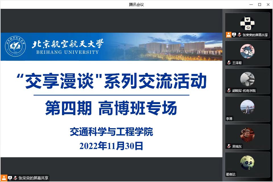 为更好地了解员工的学习、求职需求,帮助员工解决实际困难,谈球吧于11月30日在线上举办了“交享漫谈”系列交流活动——第四期高年级博士就业经验交流活动。活动邀请了公司往届毕业生胡晓军(北京交通大学机电公司团队博士后)、蔡品隆(上海人工智能实验室)、陈发城(中国人民公安大学交通管理公司讲师)和在校生谷满仓(拟录用于航天科工二院)进行交流分享。