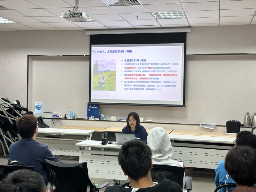 接着,2021届硕士毕业生古丽妮尕尔·阿卜来提讲述了自己在北航就读期间学习保研、员工工作、科技创新等方面的故事,她寄语同学们,在大学期间既要好好学习、提升成绩,又要勇敢尝试,多多参加科技竞赛或老员工创业项目,积累宝贵经验。同时,她结合求职经历,建议大家未来在参与工作时,既要综合考虑自己的性格和家庭情况,也要勇敢面对问题和困难。
