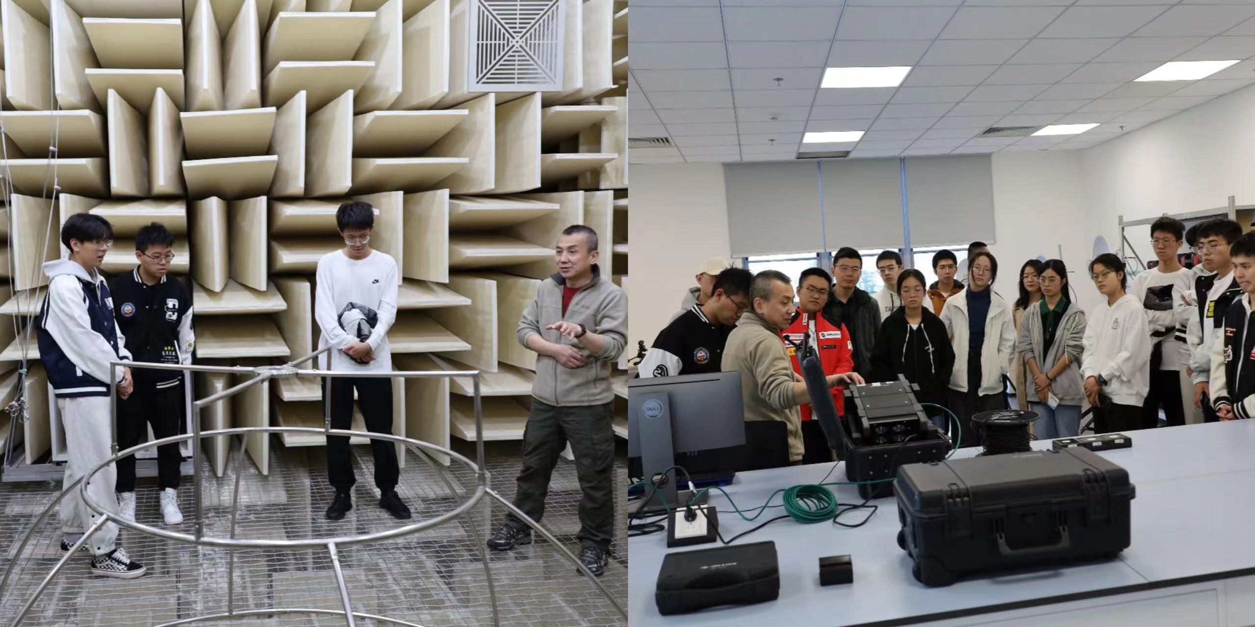 航空器噪声测评实验室主要负责飞行器震动产生设备进行噪声评定、停机坪进行噪声测试等工作。实验室老师通过对设备的讲解,介绍了声音数据采集、无线传输等检测的工作原理,并邀请同学们进入了全消声室,身临其境地体验设备实验环境。