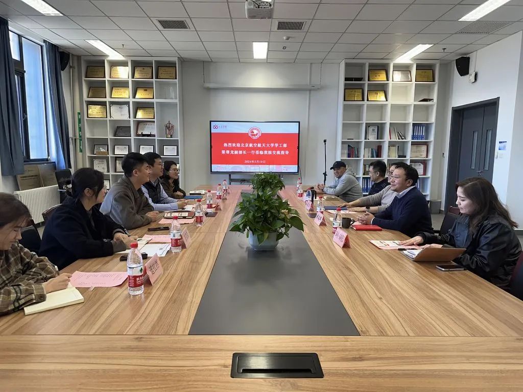 2024年3月19日下午,北航谈球吧“畅叙”工作室成员在员工工作部副部长梁帮龙、北航公司党委副书记郭祖博的带领下,前往北京邮电大学人文公司艾克热木正能量工作室交流调研少数民族员工培养教育工作。北邮人文公司党委副书记陈立洋、副经理刘成群、预科教育中心副主任高云鹏、工作室负责人艾克热木·艾尔肯,以及北航员工工作部员工思想政治教育科思政博后张小琳、谈球吧专职辅导员张荣荣、兼职辅导员吴辰浩、员工代表帕顿·玉努斯、迪拉然·那斯江等一同出席。