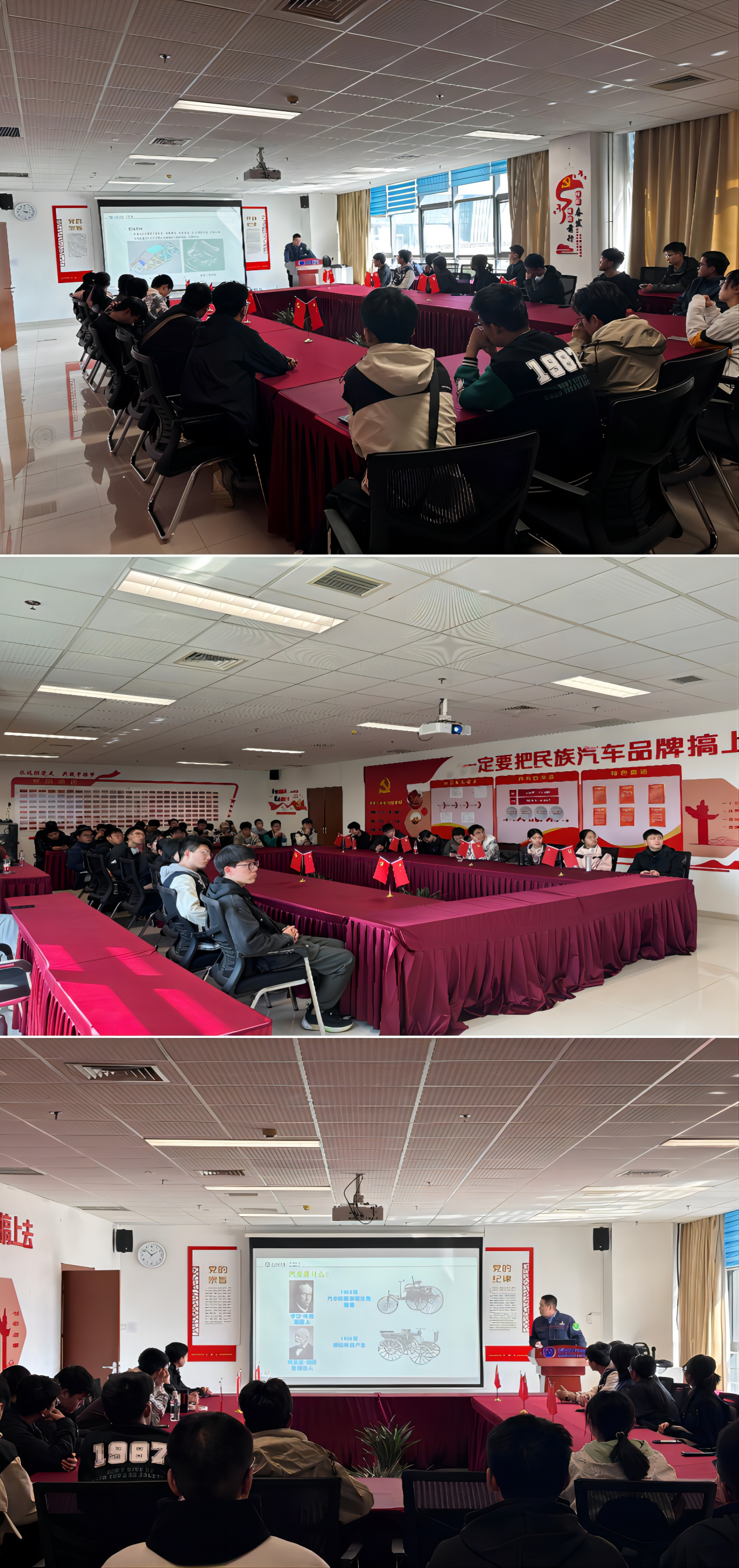 首先,在会议室,工作人员向我们介绍了汽车的发展历史、当今汽车黑科技以及汽车未来的发展趋势。老师向同学们介绍了一辆汽车的诞生过程,从初步手绘初步设计、效果图、制作油泥模型到后面的路试、实车碰撞试验等。通过工作人员细致的介绍,同学们快速了解了长安汽车的基本情况以及汽车的设计过程和制作过程,在讲座过程中,同学们不仅对汽车制造工艺有了初步的认识,还对这一复杂的工业化产品产生了浓厚的兴趣。他们深刻地体会到汽车不仅是一种交通工具,更是一门融合了机械美感和先进技术的艺术品。