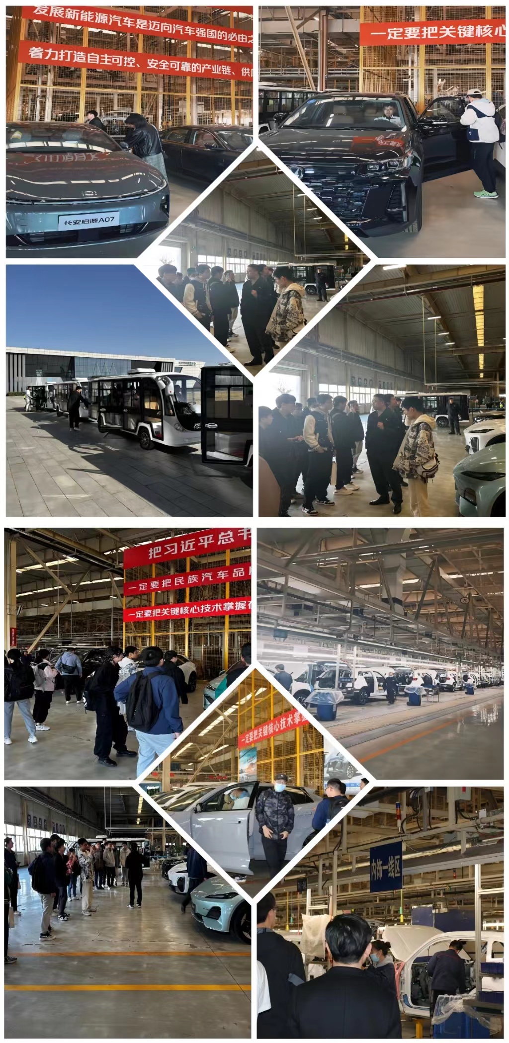 接着,同学们逐一踏入长安汽车的各个生产车间,其中包括冲压、焊接、涂装和总装四个车间。每个车间内都有专业的工作人员,他们不仅仔细解释着生产线的运作原理和工艺流程,还热情地回答着同学们的问题。在冲压车间,同学们领略到了机械与精密技术的完美结合,见证了巨型机器将钢板变形成车身雏形的惊人过程。而在焊接车间,自动化82.3%的生产率更是让同学们眼界大开。在涂装车间,细致入微的喷涂工艺为车身增添了耀眼的光泽,仿佛将汽车注入了生命。最后,在总装车间,同学们目睹了车辆从一个个零部件逐渐拼装成一辆辆完整的汽车的神奇过程,深深感受到了团队合作和技术力量的不可思议。随着观光车缓缓移动,同学们心中的对高端制造业的向往和敬畏之情也愈发浓厚。这趟参观之旅不仅开阔了他们的视野,更激发了他们对科技与工业的热爱与探索欲望。