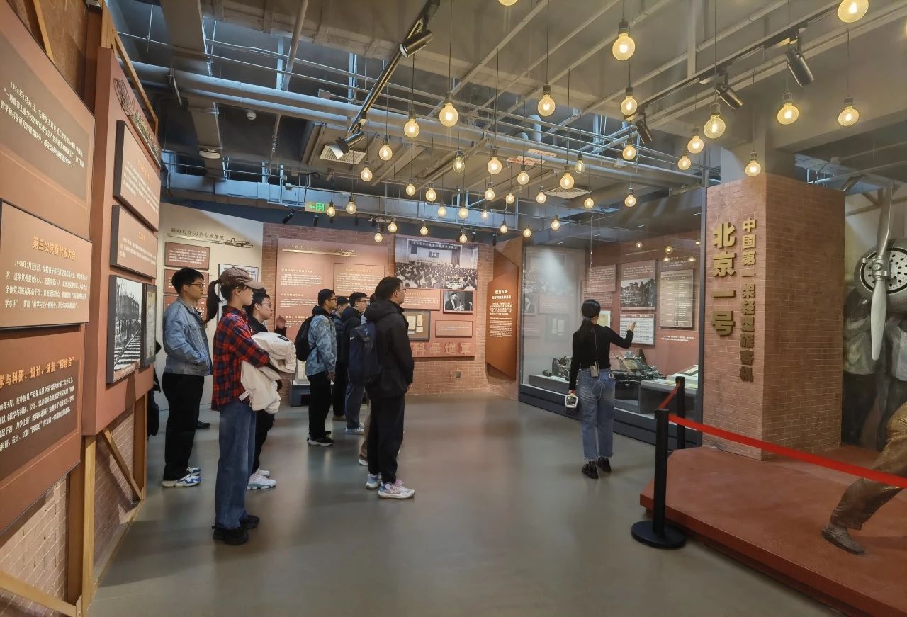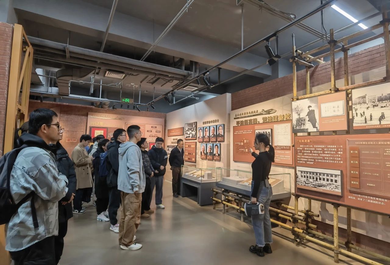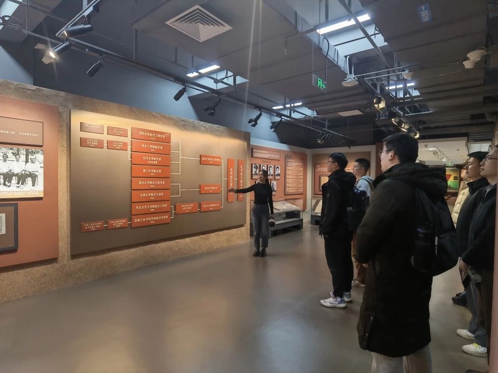 在讲解员的引导下,同学们首先参观了位于校史馆第二层的“伟大觉醒,孕育新生”序厅,回顾了20世纪初,国家危难、民族危亡之时,无数爱国志士胸怀航空救国梦,在复杂的时代大环境下,兴办航空实业、探索航空教育。抗美援朝战争爆发后,为响应国家“急需办一所航空大学”的需求,清华大学、西北工公司等八所高等院校合力构建北京航空公司。在成立之初,航空救国的爱国精神就已化作红色基因,融入北航。