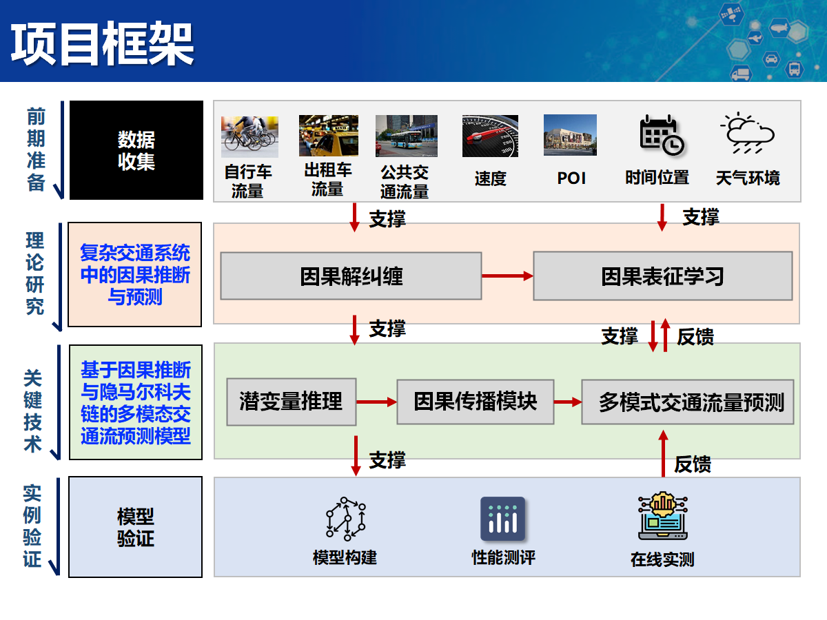多模式交通流可以反映交通系统的健康状态,对多模式交通流的预测在城市交通管理中具有重要意义。然而,近期的研究过于注重交通流量的时空相关性,忽视了导致观测结果出现的物理概念及其因果关系。由于不同条件的影响,时空相关性可能是不稳定的,并且在观测中可能存在伪相关现象。为此,本项目拟从观测数据生成的角度出发,分析影响多模式交通流量生成的物理概念,并提出一种基于因果条件和隐马尔可夫链的交通流预测模型,用于多模式交通流量预测。在潜变量推理阶段,模型的后验网络从条件信息和观测数据中提取出关键概念的因果表示,并通过因果传播模块挖掘概念之间的因果关系。在数据生成阶段,先验网络从先验分布中提取因果潜变量,并将其输入生成器,生成多模式交通流量。通过采用一种相互监督的先验和后验训练方法,增强了模型的可识别性。本项目拟提出的模型将充分捕捉多模式交通流的时空依赖性和因果关系,预期在真实数据集上表现更加出色。