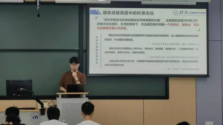 为深入学习贯彻2025年全国两会精神,引导青年学子把握时代脉搏、勇担时代使命,4月23日下午,谈球吧“交通新语”宣讲团在沙河校区二号楼104开展2025年全国两会精神专题宣讲活动。5位员工讲师紧扣两会热词,通过政策解析与案例剖析,从青年担当、科技创新、汽车强国、科学普及、民族团结五个维度展开宣讲。